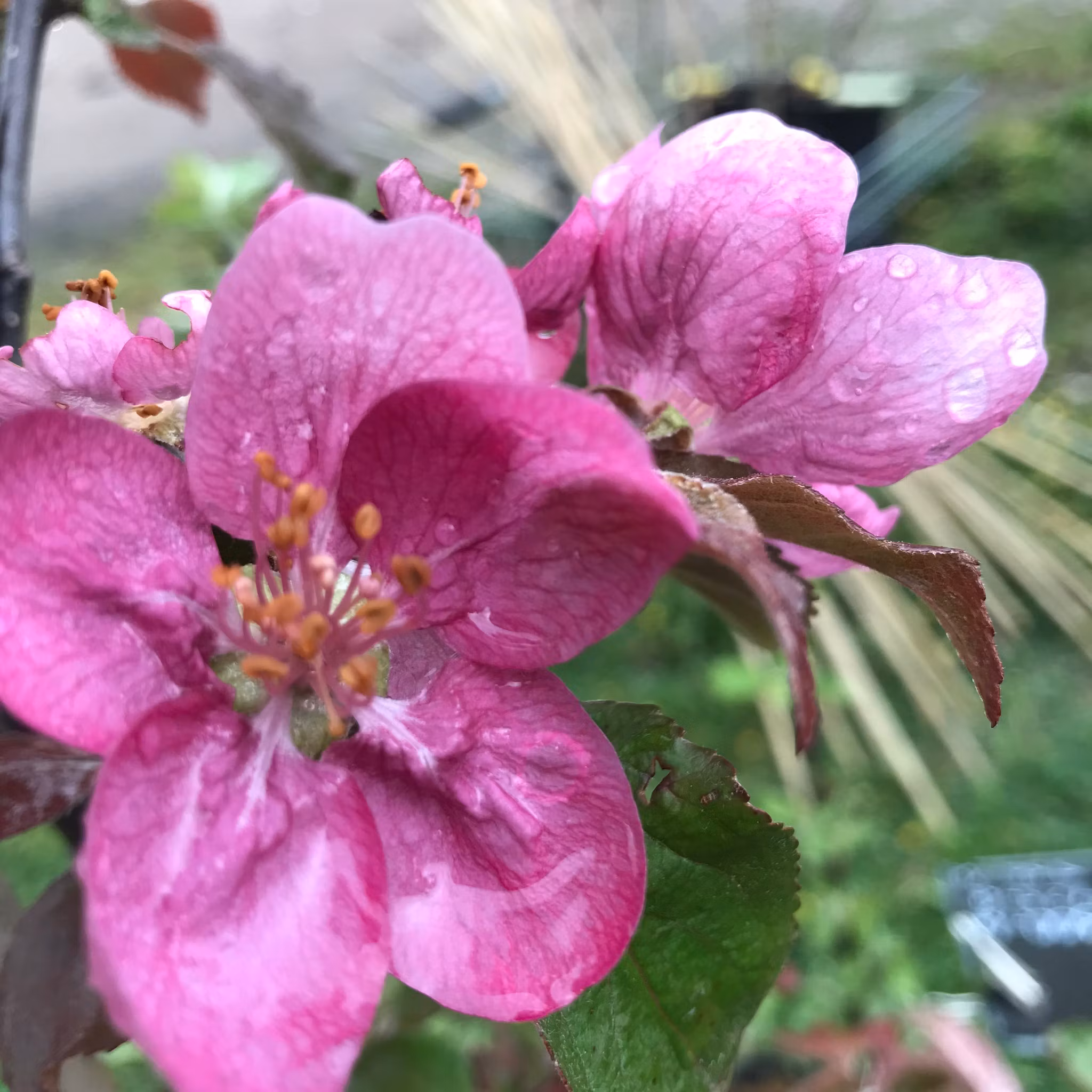 Kuriosa: mörkt puder-lila-rosa, helt underbara, blommor! Ett sant smycke. Rött fruktkött. Även bladen drar åt det vinröda håller.