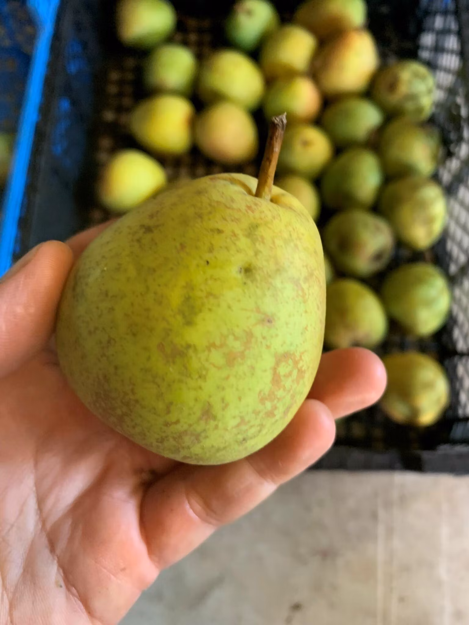 Frukt: Medelstor, söt med fin syra. Fint fruktkött. Aromen liknar sorten Anjou. Gröngult skal.